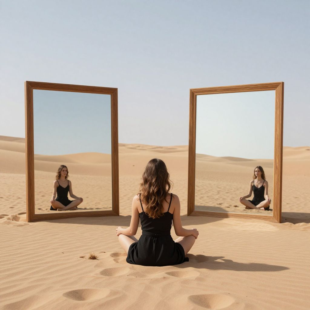 Woman sitting cross-legged in a vast desert, surrounded by two large wooden-framed mirrors that reflect her serene posture and the expansive sandy landscape, evoking a sense of introspection and solitude.