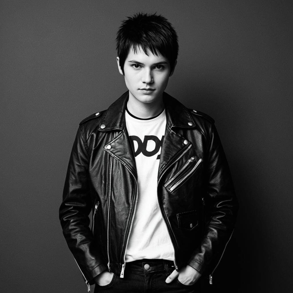 Self cosplay, Joy Division Richard Boon, simple punk style, short dark hair, white crew neck shirt, black leather jacket, slim cut jeans, monochrome background