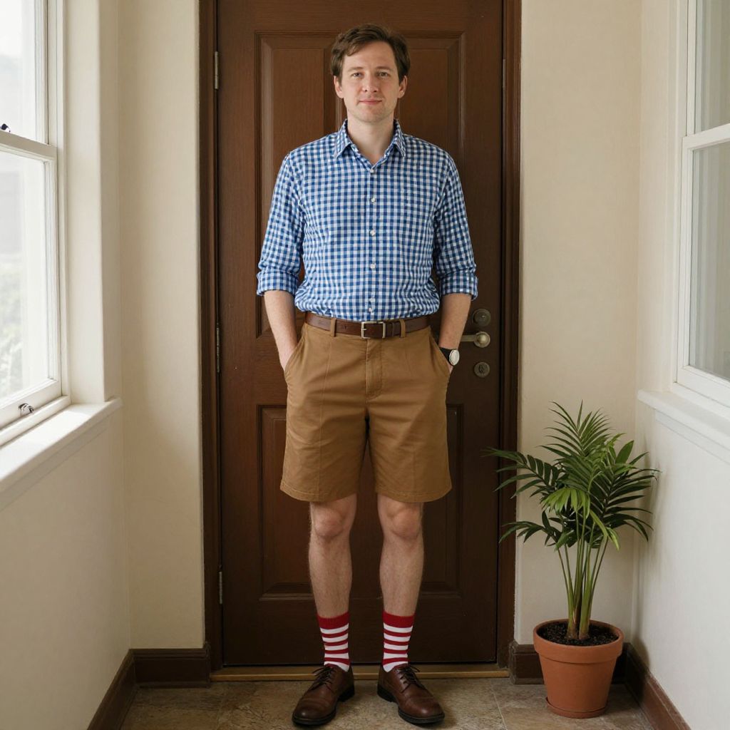 A man with short brown hair, wearing a blue and white checkered shirt, brown shorts, and red and white striped socks, standing with his hands in his pockets, wearing brown shoes and a brown belt. He is standing in front of a brown door, with a plant in the corner. The man has a confident and relaxed posture, exuding a sense of casual charm. The scene is set in a simple, lived-in interior with soft natural light filtering through windows, adding warmth to the overall atmosphere.