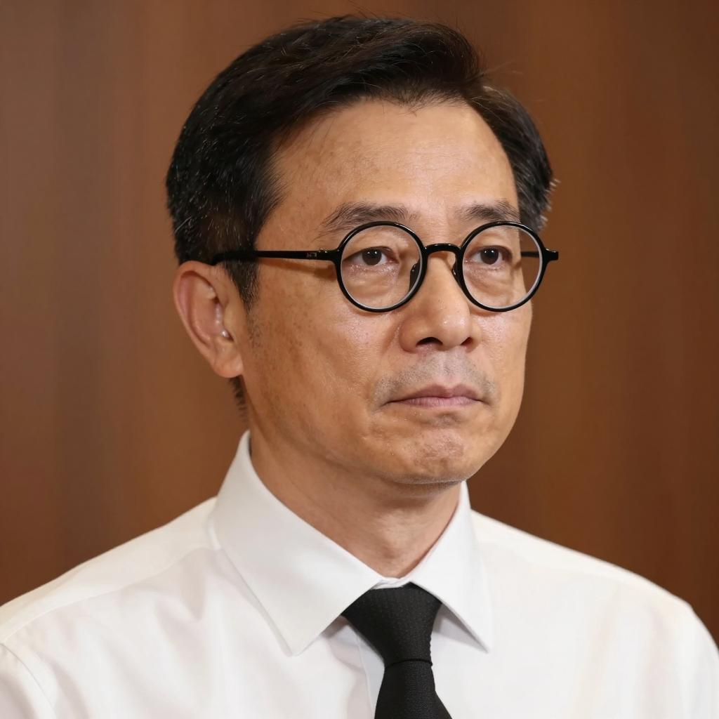 Middle-aged man with dark hair, mustache, wearing black suit, white shirt, and maroon tie, seated in ornate, dark wooden chair. Blurred background. Serious expression. Single person. Photographic image.