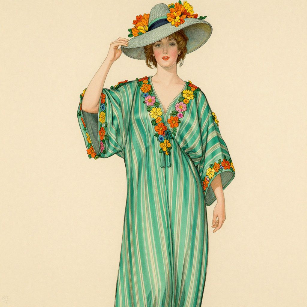 This is a digital illustration of a woman standing against a plain, light yellow background. She has fair skin and brown, wavy hair peeking out from under a wide-brimmed, green and white striped hat adorned with orange and yellow flowers. She wears a loose, green and white striped robe with matching floral accents along the neckline, sleeves, and hem. Her right hand is raised to touch the brim of her hat, while her left hand rests in her robe pocket. Her expression is neutral, and she gazes slightly downward. The illustration has a vintage, slightly whimsical style with bold, clean lines and vibrant colors.