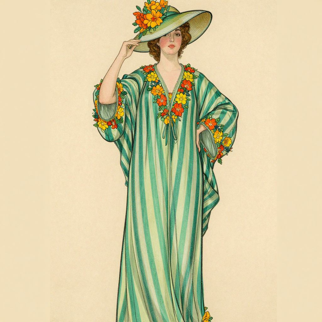 Elegant fashion illustration by Léon Bakst for Paul Poiret, 1911, showcasing a woman in a flowing green-striped robe with vibrant floral trim, paired with a matching wide-brimmed hat adorned with orange and yellow blossoms, set against a soft beige background.