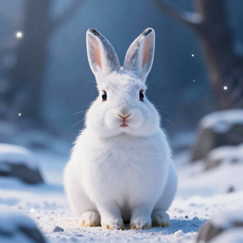 Hyper-realistic image of a cute husky dog standing in an enchanted wonderland. The environment features a whimsical fantasy setting with glowing particles, softly illuminated lanterns, and a slate blue color theme. The husky has thick fur with black, white, and gray markings, bright eyes, and a curled fluffy tail. The detailed background includes trees, stones, and soft plants, creating a magical and serene forest atmosphere.
