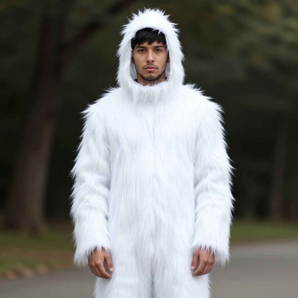 "youth yeti costume, male focus, 1boy, solo, hood, full body, realistic, outdoors, facial hair, short hair, standing, forehead protector, black hair Realistic photo of casual sexy person with pretty face"