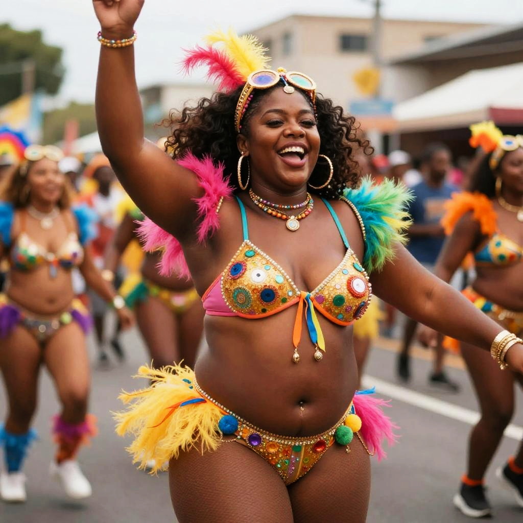 Thicc woman dancing energetically in colorful street festival, vibrant costumes, motion blur effect, festive atmosphere, joyful expression, high detail digital painting