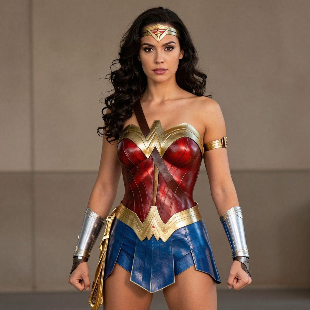 A woman cosplaying as Wonder Woman stands confidently, showcasing the iconic costume with its vibrant colors and detailed design, embodying the heroic and artistic spirit of the character.