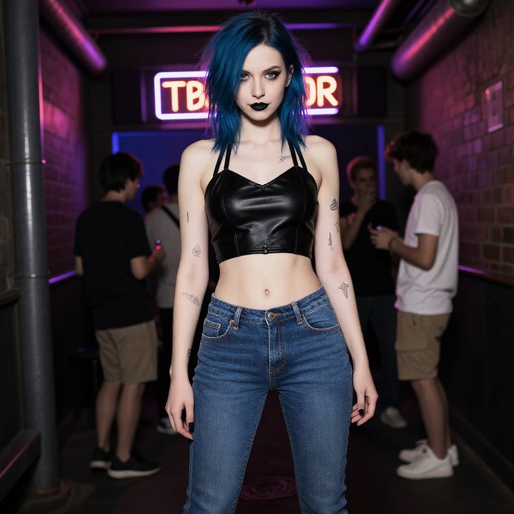 Photograph of a pale-skinned, blue-haired woman with black lipstick, tattoos, black leather crop top, and blue jeans, standing in a dim