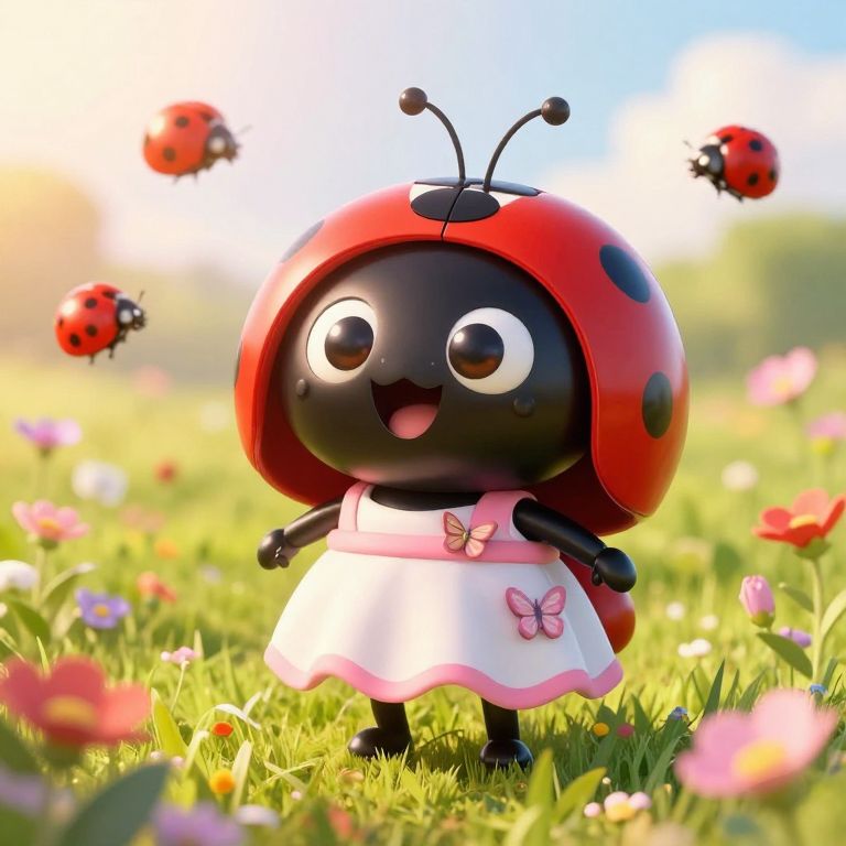 A whimsical and cute Ladybug girl with bright red and black coloring, standing on a sun-drenched meadow with blooming flowers, her large sparkling eyes wide with joy, wearing a soft pink and white dress with tiny butterfly clips, surrounded by fluttering ladybugs in a dreamy, playful atmosphere with golden-hour lighting.