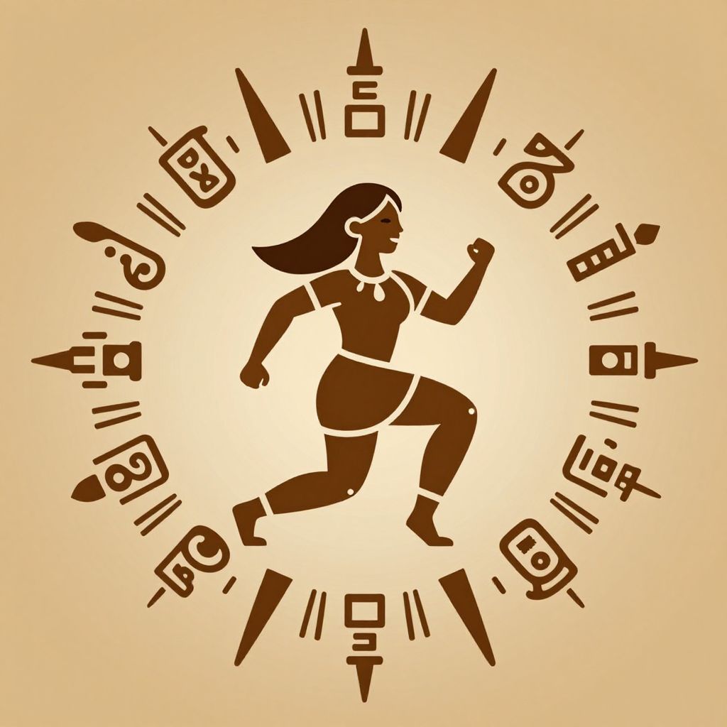 A stylized graphic icon depicts an energetic woman in a dynamic pose, surrounded by a sunburst pattern, reminiscent of Mayan hieroglyphs.