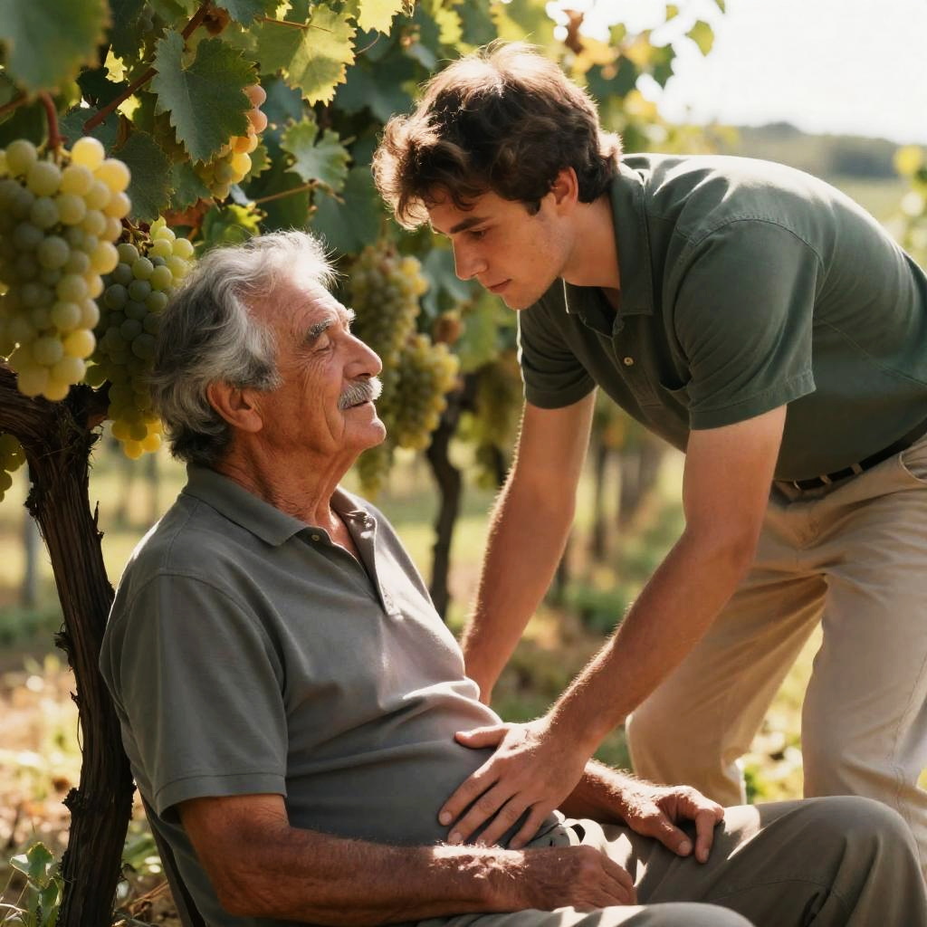 Photograph of an older man with gray hair and a mustache, sitting against a grapevine with clusters of grapes. Young man with brown hair, wearing a green shirt and beige pants, leans forward, hand on older man's stomach. Sunlit vineyard background. Older man's eyes closed, young man's intense expression.