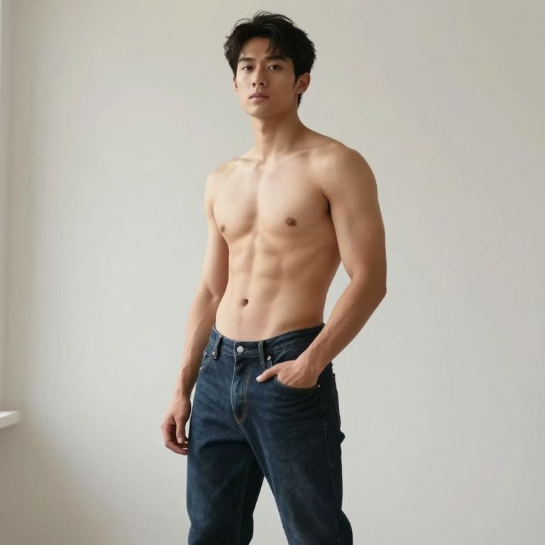 Photograph of a shirtless young Asian man with a toned, muscular build, short black hair, wearing dark blue jeans, standing against a plain white