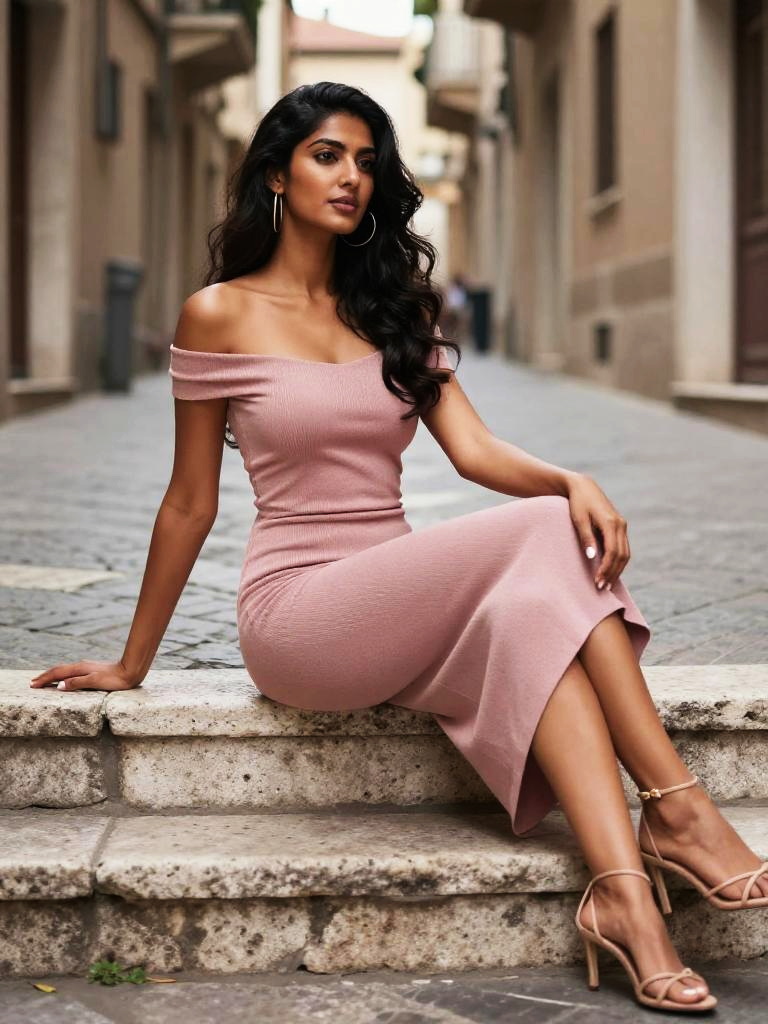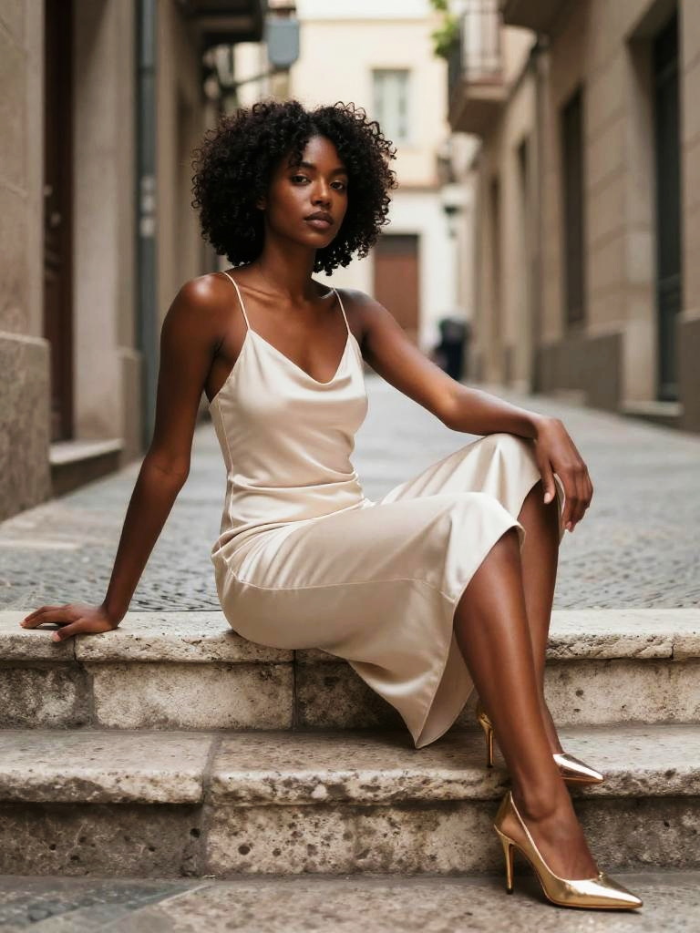 Fashion street photo of mixed-race woman with shoulder-length curly hair and bold brows, sitting sideways on old stone steps in a narrow European alley, one arm resting on the step and the other on her knee, wearing a form-fitting burnt orange ruched bodycon dress with a side slit with delicate metallic gold stilettos, soft natural evening light, cinematic depth of field, high-resolution editorial photography