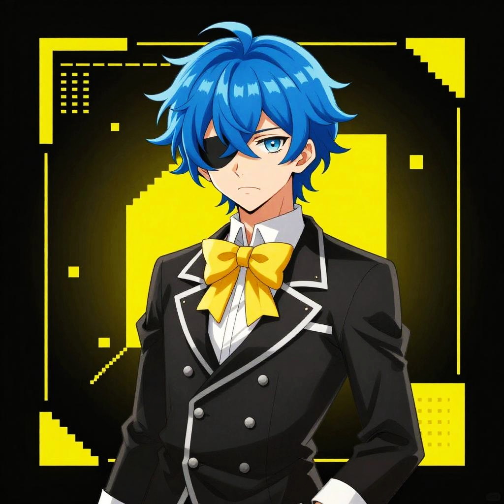This is a digital drawing of an anime-style character with vibrant blue hair and a serious expression. They're wearing a formal black jacket with white cuffs, a yellow bow tie, and a white shirt. The background is black with yellow geometric shapes and lines, giving a futuristic vibe. The character's hair is wavy and covers one eye, adding a mysterious touch. The overall style is bright and pixelated.