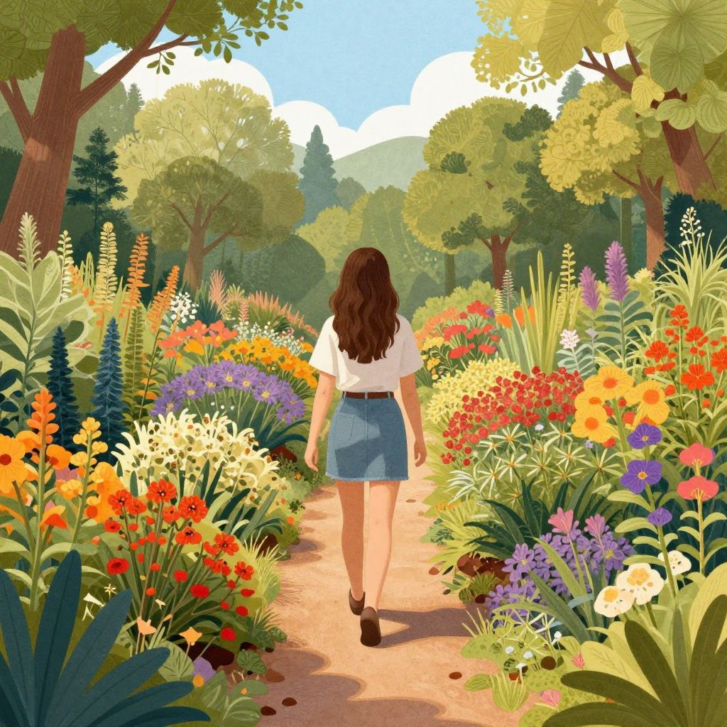 Song childrens book style of acrilyc painting with brush texture, flat color, solid color block, of a forest sunrise scene with middle age women of Indian ethnicity doing a morning run,