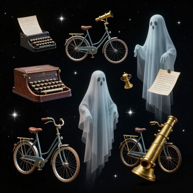Digital illustration featuring five translucent blue ghost figures with black oval eye holes, floating against a starry black background. Surrounding the ghosts are various vintage objects: an antique typewriter in the top left, a dark blue bicycle with a brown seat and handlebars in the top center and bottom left, a burgundy typewriter with gold accents in the top right, a brass bell in the center, and a brass bicycle horn in the bottom right. Each ghost holds a sheet of paper with text. The scene has a whimsical, eerie atmosphere with a mix of nostalgic and supernatural elements.