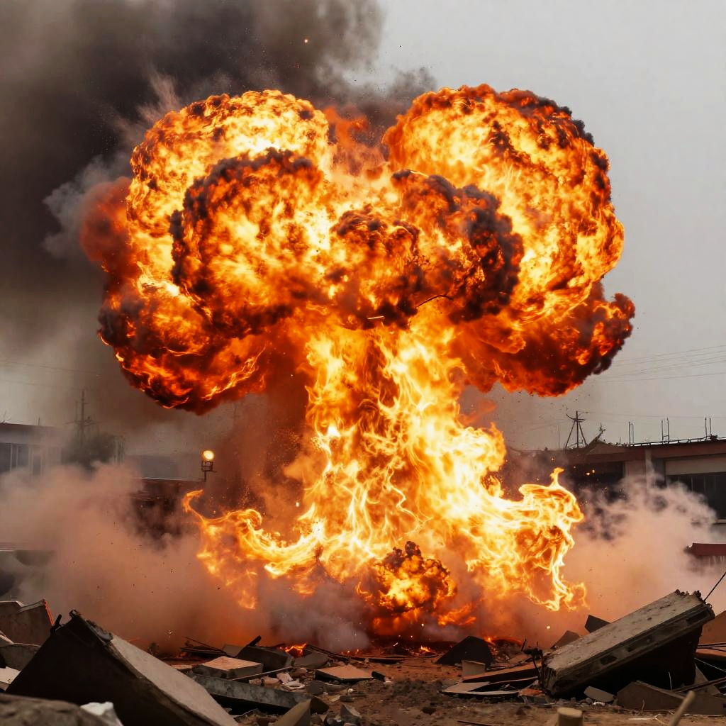 Realistic explosion drawing featuring a massive fiery blast in a warzone, intense flames and smoke billowing upwards, scattered rubble and dust clouds, vibrant orange and yellow tones, intricate lighting effects, thick smoke layers, realistic texture and depth.