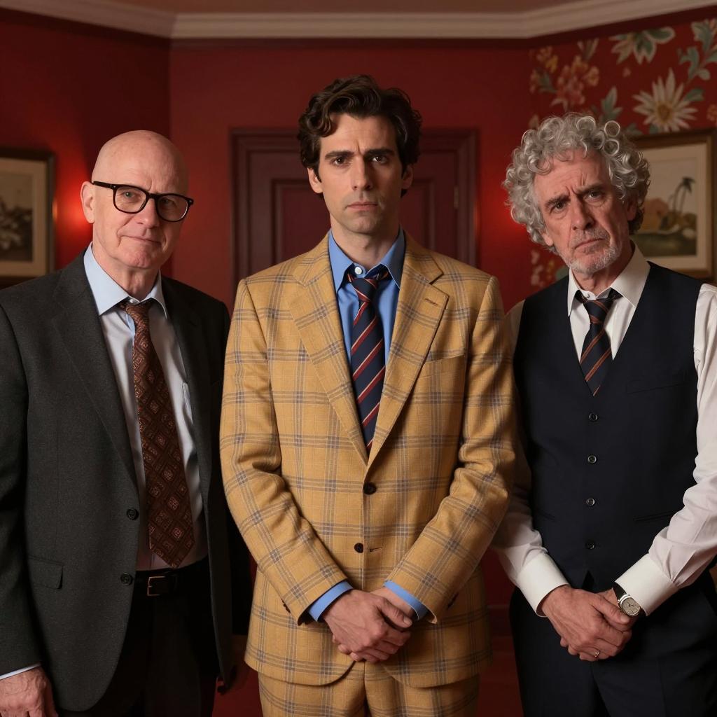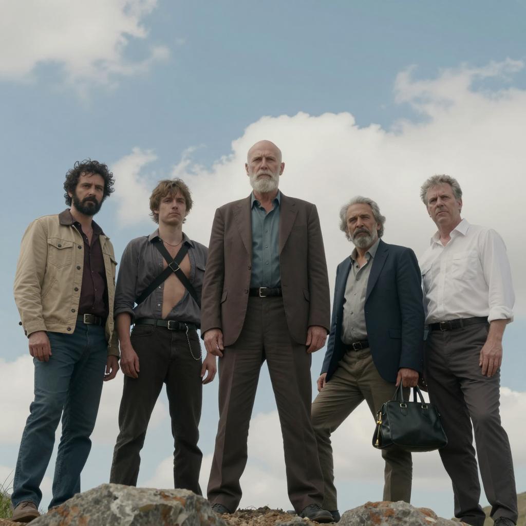 Six men standing in a garden with pink and red flowers. First man wears a hat and beige jacket, second in dark suit, third in blue shirt and cap, fourth bald with white shirt and overalls, fifth in black shirt, sixth in gray overalls. Background: dark green trees. All men have casual postures, facing forward. Fifth man slightly forward, hand on hip. Fifth and sixth men have intense expressions. Sixth man has dark skin, others light-skinned. Bright daylight.