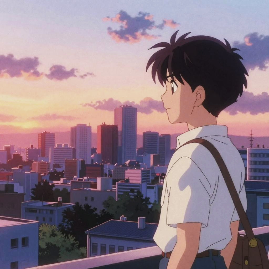 Anime picture filter effect applied to a vibrant cityscape at sunset, emphasizing soft pastel colors and bold outlines, capturing the essence of classic anime art style with a dreamy, nostalgic atmosphere and subtle grain texture.