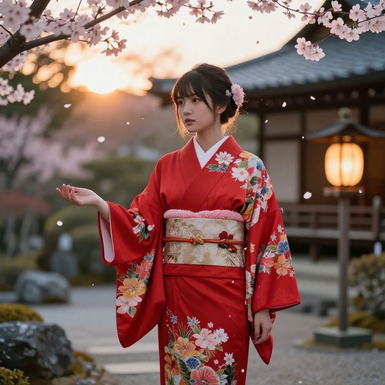 Fengling (furin-jp) walking through a twilight garden with lanterns, glowing cherry petals floating in the air, traditional Japanese architecture in the background, delicate makeup, dreamy palette, soft shadows, fantasy realism, high detail.