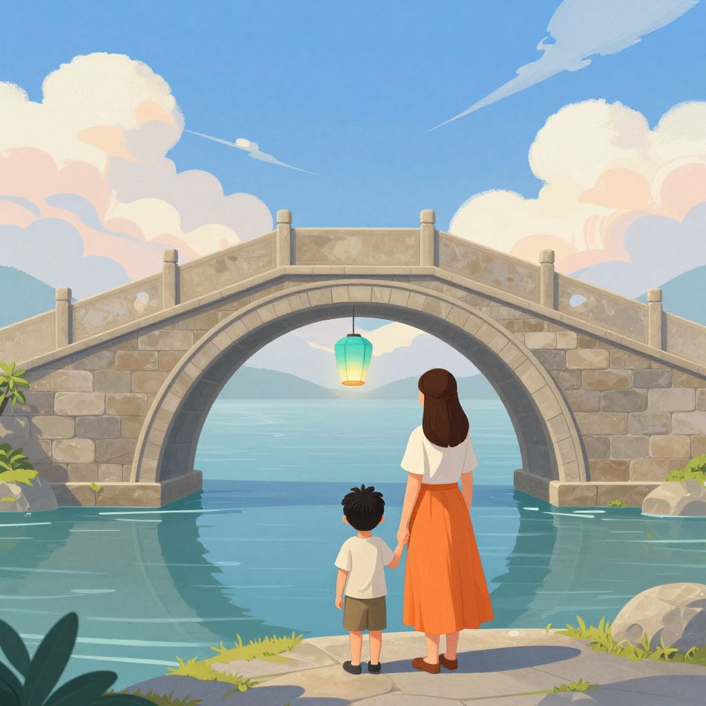 Digital illustration of a mother and child, holding hands, standing on a stone bridge over a blue river, under a lantern, with a bright blue sky