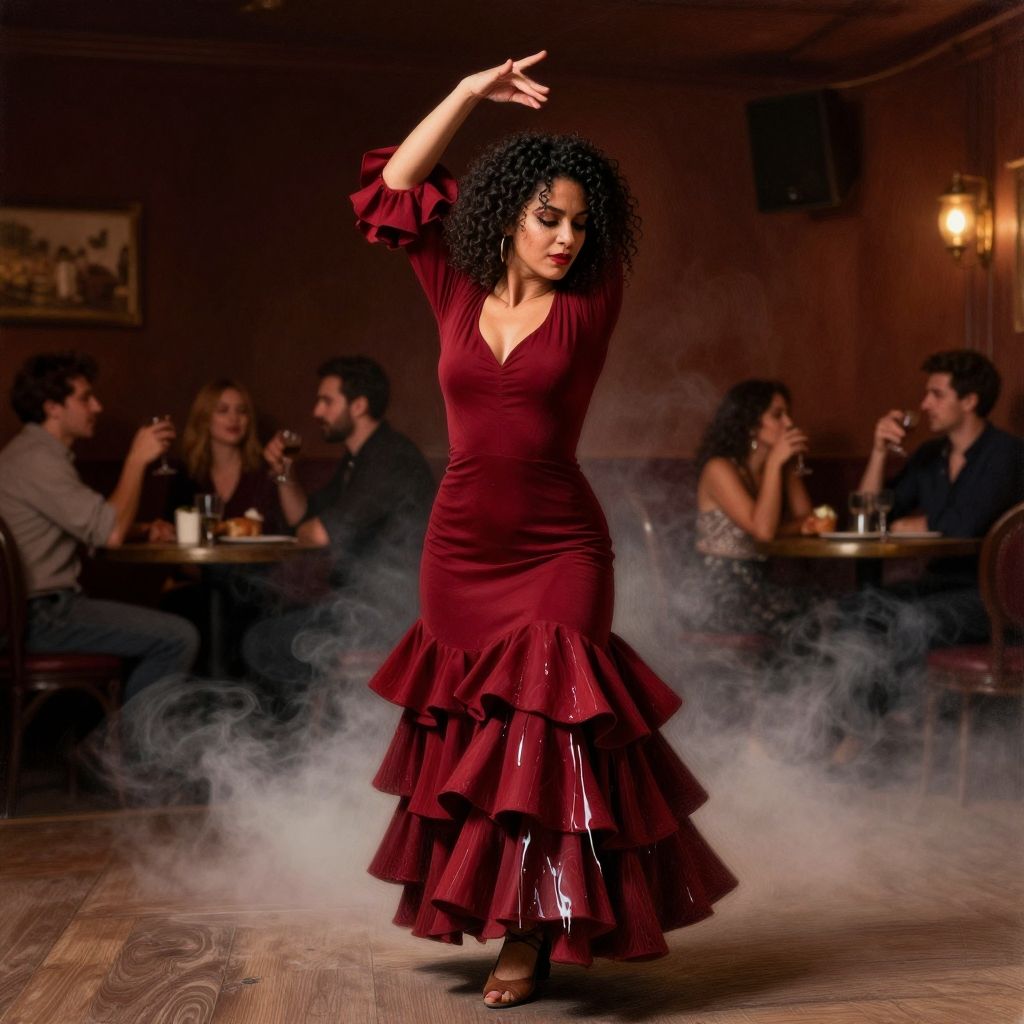 Ultra realistic full body color pencil drawn portrait of a female black curly haired Flamenco dancer in a bright burgundy red dress, dancing in a (smoke filled bar:1.4). (layer of smoke hanging below the ceiling:1.4), ral-dissolve, (her dress dissolving like dripping wet paint), background: patrons in the bar drinking and enjoying the dance, Background color a very dark intense brown tint, Dark theme, dynamic lighting, (soft shadows), (soft focus), (photo realistic), uhd, 8k
