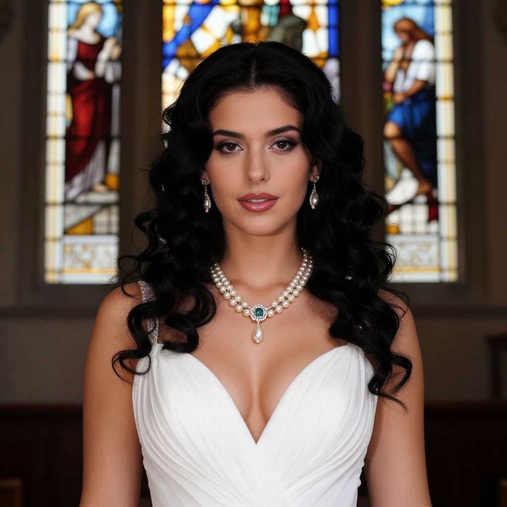 "mavis dracula wedding dress, 1girl, solo, dress, jewelry, necklace, black hair, earrings, white dress, breasts, makeup, lipstick, curly hair, pearl necklace, wedding dress, cleavage, church, stained glass Realistic photo of casual sexy person with pretty face"