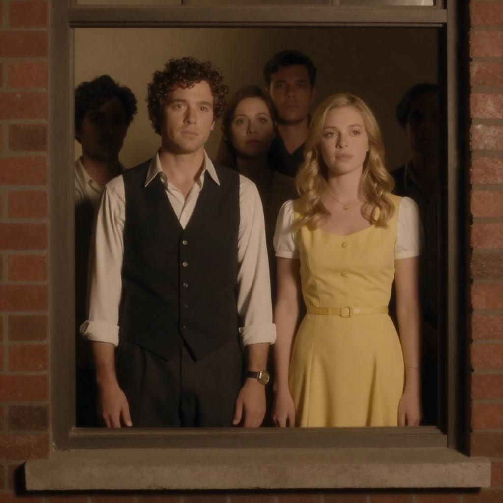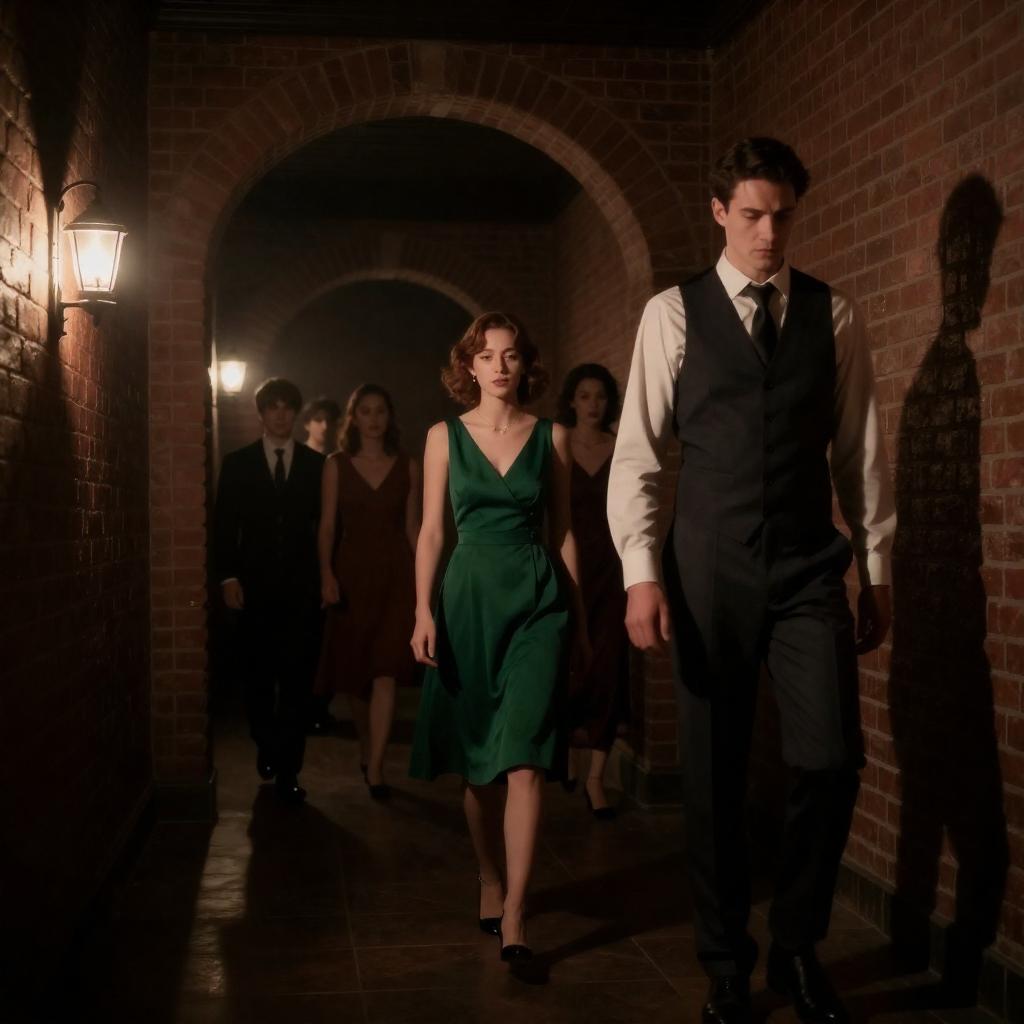 Dark hallway with brick walls and archway. Tall man in vest and tie on right, looking down. Woman in green dress in center. Five people in background, partially illuminated by lanterns. Low light, dramatic shadows.