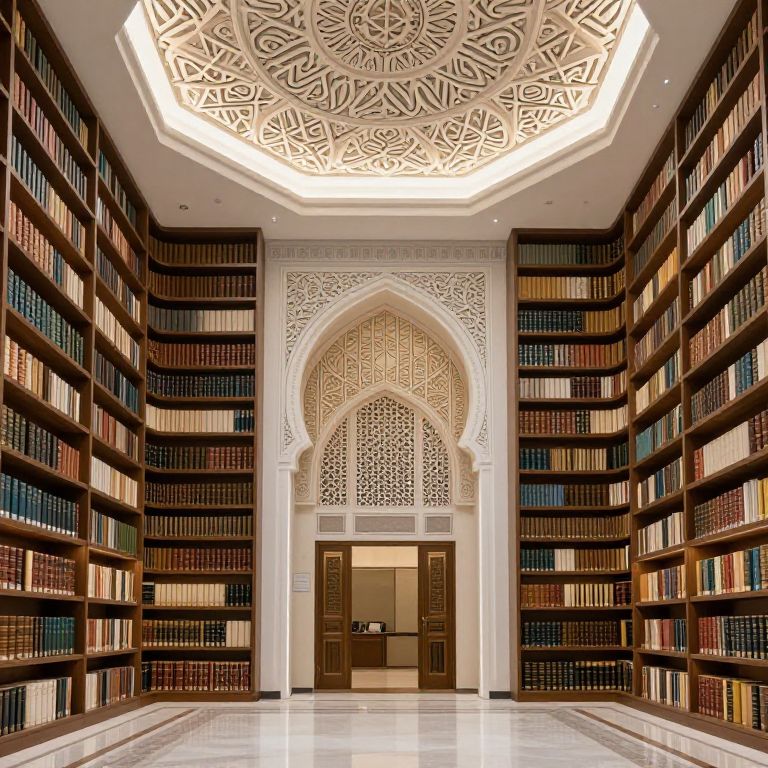 Islamic image prompt: A modern Islamic library with a grand entrance and flowing symmetry, bookshelves adorned with ancient manuscripts, soft ambient light, intricate arabesques in the ceiling, blending tradition with contemporary design.