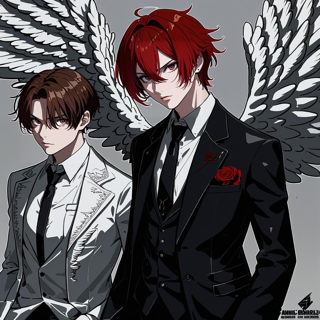 Digital anime-style illustration of a female angel character with red medium-length hair, amber eyes, and large white feathered wings. She is wearing a formal black suit with a white collared shirt and black necktie. Behind her stands a male figure with brown hair and a glowing halo above his head, dressed in a similar black suit. The image features a dark, gradient background, emphasizing the angelic and formal theme.