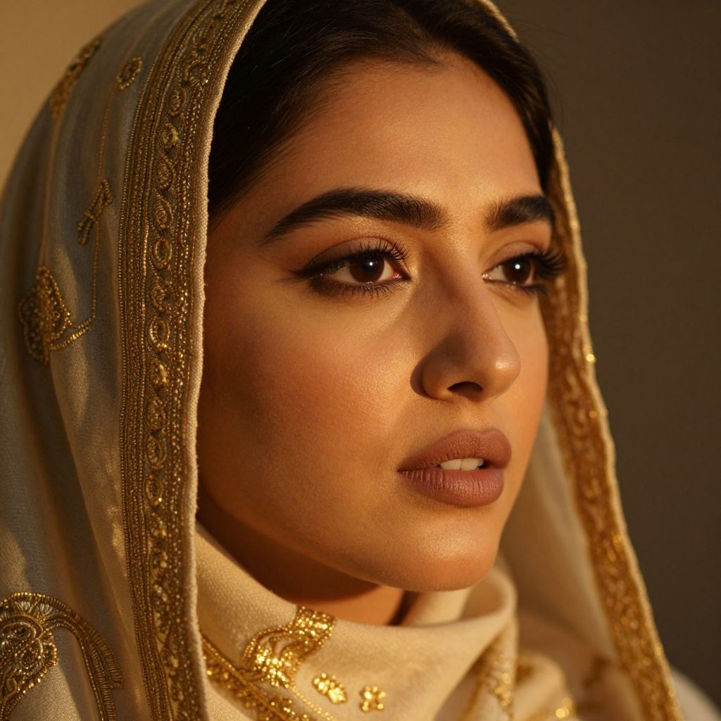 Imagine a captivating portrait of a Middle Eastern woman with intense dark eyes, accentuated by arched eyebrows. Her flawless olive skin glows with warm golden light from an unseen source. This close-up view highlights the intricate gold embroidery adorning her hijab, which dances along its edges. The subtle contours of her high cheekbones and full lips are beautifully defined. As she gazes thoughtfully into the distance, her expression exudes a fascinating blend of introspection and warmth, inviting viewers to explore the depths of her soul through this elegant portrait that showcases both intricate beauty and cultural significance.