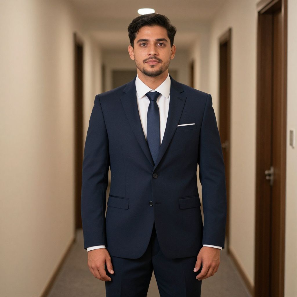 Photograph of a handsome, young South Asian man in a dark navy suit, white shirt, and black tie standing in a brightly lit, empty hallway