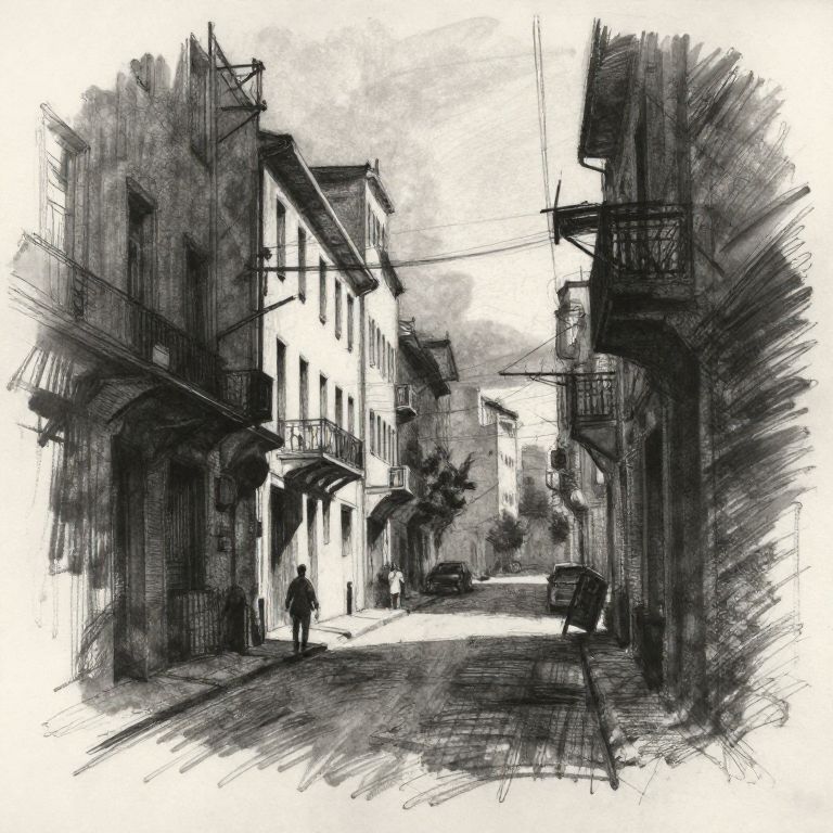 Pictures of art drawings depicting detailed charcoal sketches of urban scenes, featuring bold contrasts, smoky textures, and a dramatic interplay of light and shadow, emphasizing architectural lines and atmospheric perspective