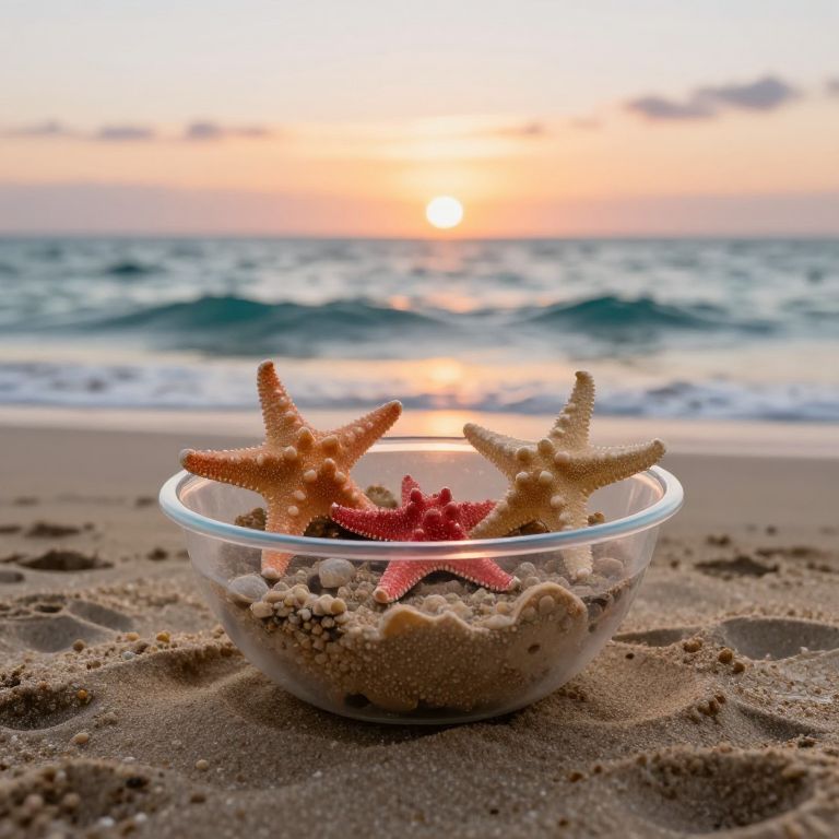 Photograph of a glass bowl with two starfish and a red starfish on sandy beach, ocean waves in background, sunset sky.