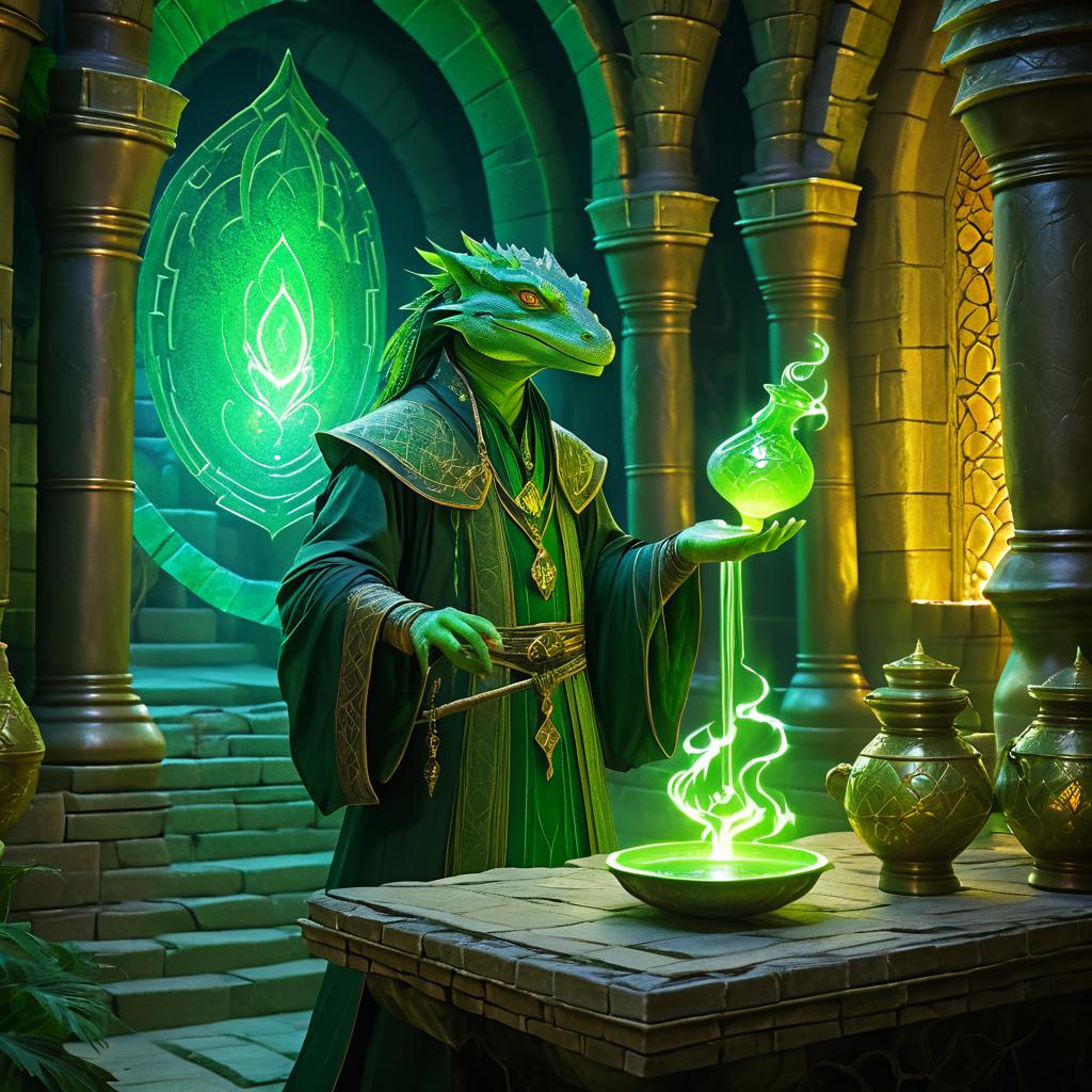 Anthropomorphic lizard warlock brewing a potion in an ancient temple. Styled as cinematic Magic: The Gathering artwork with volumetric lighting by Rebecca Guay.