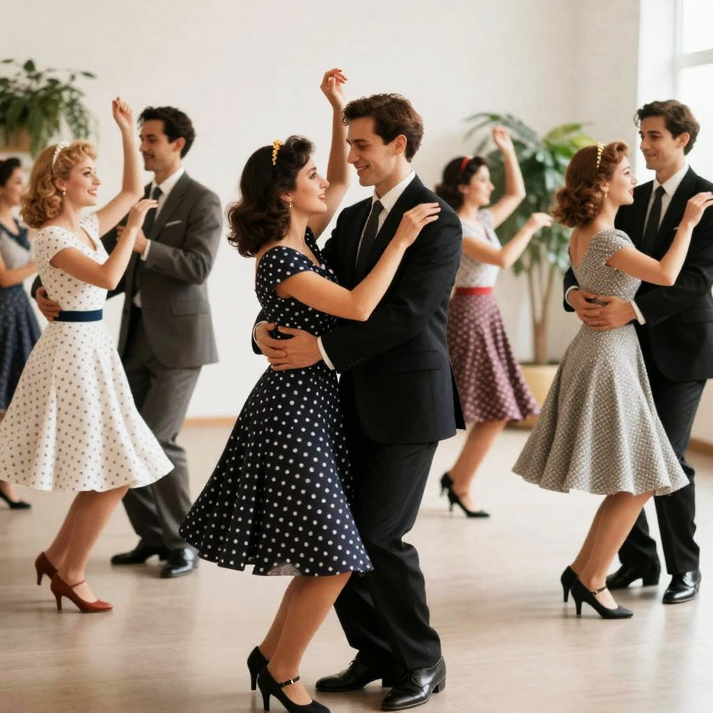 Photograph of a dance party. Multiple people in mid-dance, dressed in 1950s-style clothing. Women in dresses with polka dots and lace, men in suits. Brightly lit indoor setting with potted plants in the background. Dancers in motion, smiling, arms raised. Main focus on central couple, surrounded by other dancers.