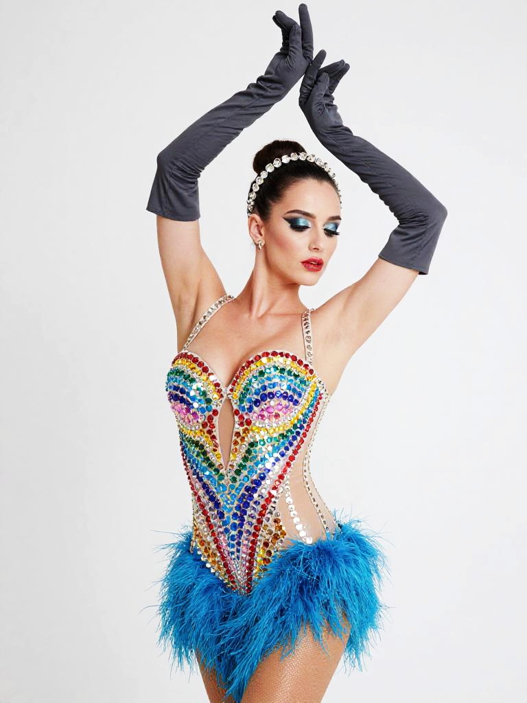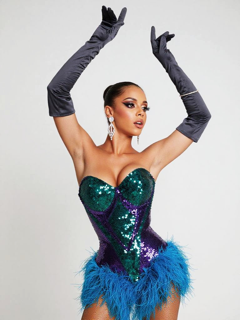 High-energy studio portrait of a show performer woman with big breasts and pretty face, pale skin with shimmering highlighter and pink lips, wearing a fiery red and orange sequin corset costume with a feathered skirt, arms raised gracefully above her head, long midnight blue opera gloves, bold stage makeup, clean white studio background, rhinestone drop earrings and a slim bracelet, vivid fashion editorial photography, sharp high resolution