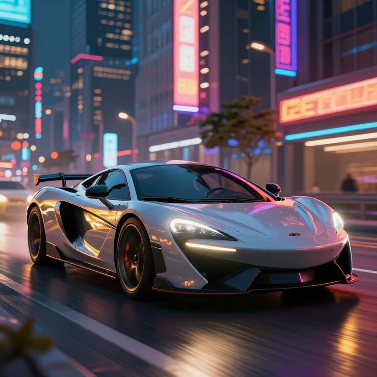 A sleek, high-definition 3D-rendered sports car glides through a vibrant cyberpunk cityscape at night, illuminated by neon lights and dramatic golden-hour reflections on its polished surface, evoking the intense energy of a \"Need for Speed\" movie scene.
