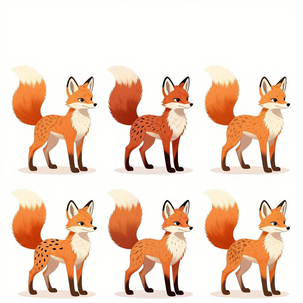 Illustration of six fox-like creatures with large, curled tails. Each has distinct colors and patterns: