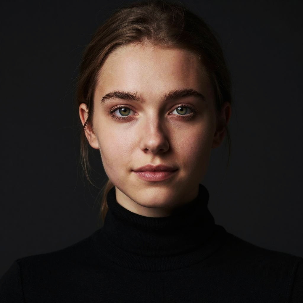 Photograph of a young woman with fair skin, light brown hair pulled back, and green eyes. She's wearing a high-neck black top. The background is dark, creating a stark contrast that highlights her face. Her expression is neutral, with a slight, natural smile. The image has a high-contrast, dramatic lighting that emphasizes her features and skin texture.