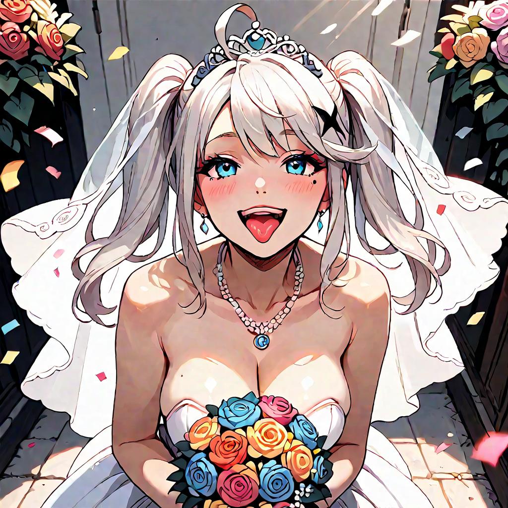 Digital anime-style illustration of a cheerful bride with long white twintails and an ahoge, wearing a strapless wedding dress and a tiara. She has bright blue eyes with a mole under one eye, blushing cheeks, and small fangs. The bride holds a colorful bouquet of pink, blue, and orange roses, standing in a garden setting with scattered confetti. She is smiling with her mouth open, adorned with a matching necklace and earrings.