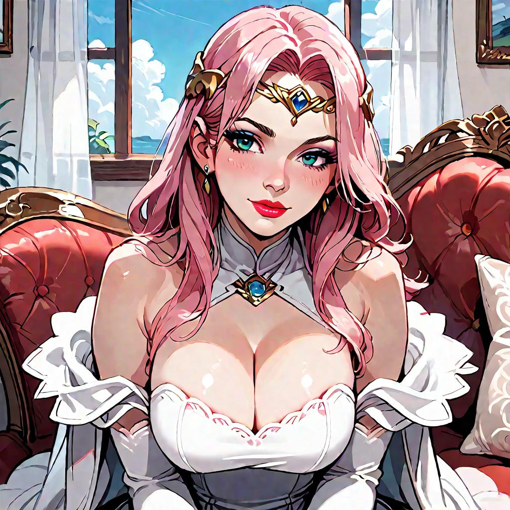 Score_9, score_8_up, score_7_up, source_anime, aakana, long hair, twintails, ahoge, x hair ornament, mole under eye, eyes visible through hair, blush, fangs, large breasts, tiara, wedding dress, strapless, necklace, standing, smile, open mouth, bouquet, garden, confetti
