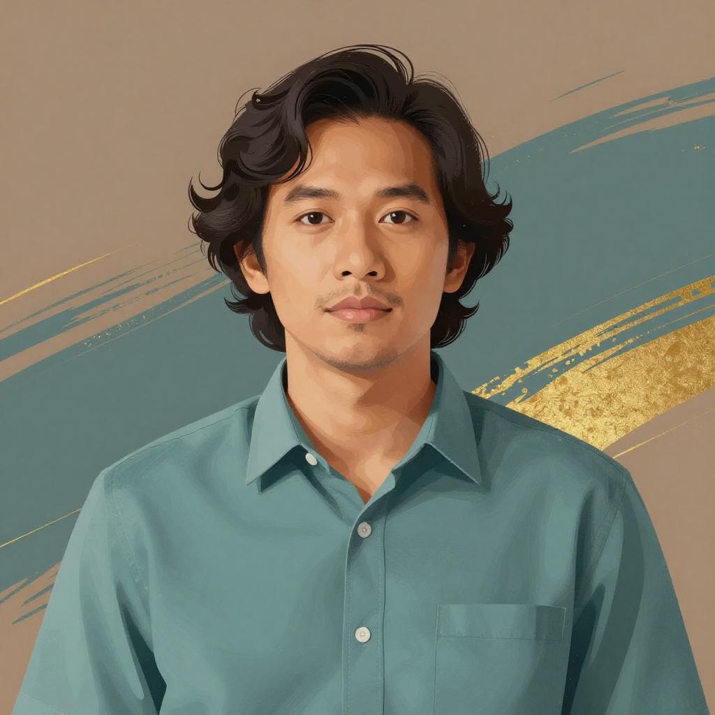 Digital illustrated portrait of a Southeast Asian man with medium wavy black hair wearing a teal shirt. The image features earthy tones with a teal and gold abstract background, created in a high-quality poster style.