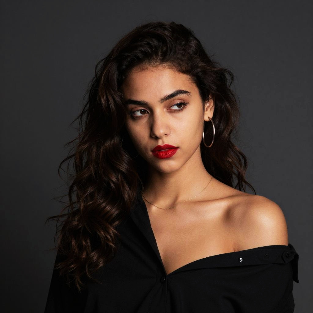 Photograph of a young woman with long, wavy, dark brown hair and olive skin, set against a dark blue-gray background. She has bold, arched eyebrows, striking red lipstick, and wears large silver hoop earrings. Her black off-the-shoulder top reveals her collarbones. The lighting highlights her facial features and creates a soft glow on her skin. Her expression is neutral, with a slight, mysterious gaze. The overall style is modern and chic, with a focus on her facial beauty and minimalistic, yet elegant, attire.