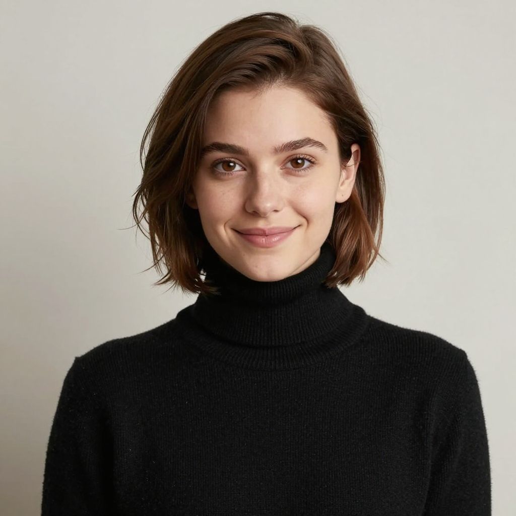 Digital portrait of a smiling young woman with short brown hair, large brown eyes, and fair skin, wearing a black turtleneck sweater in a warmly