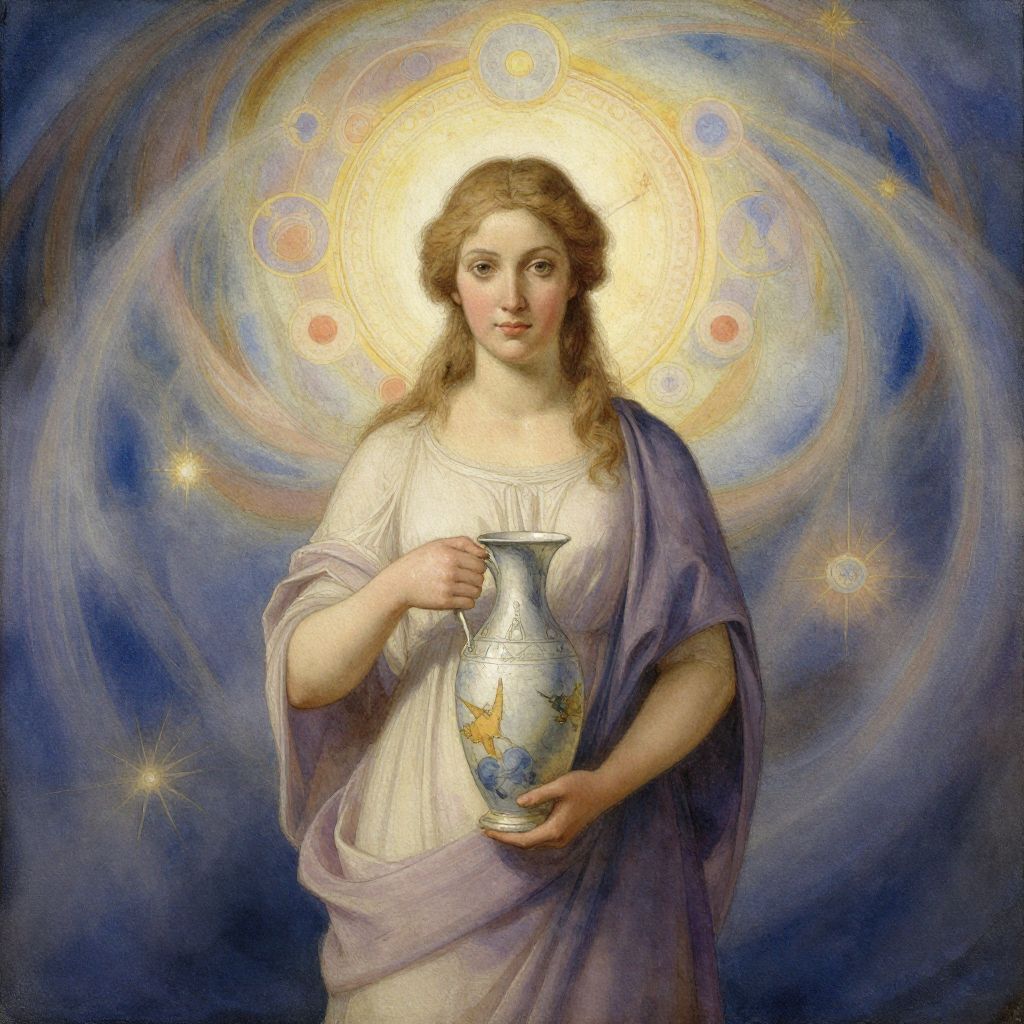 Digital painting of a serene, fair-skinned woman with brown hair, holding a decorated vase, haloed by a radiant, cosmic background.