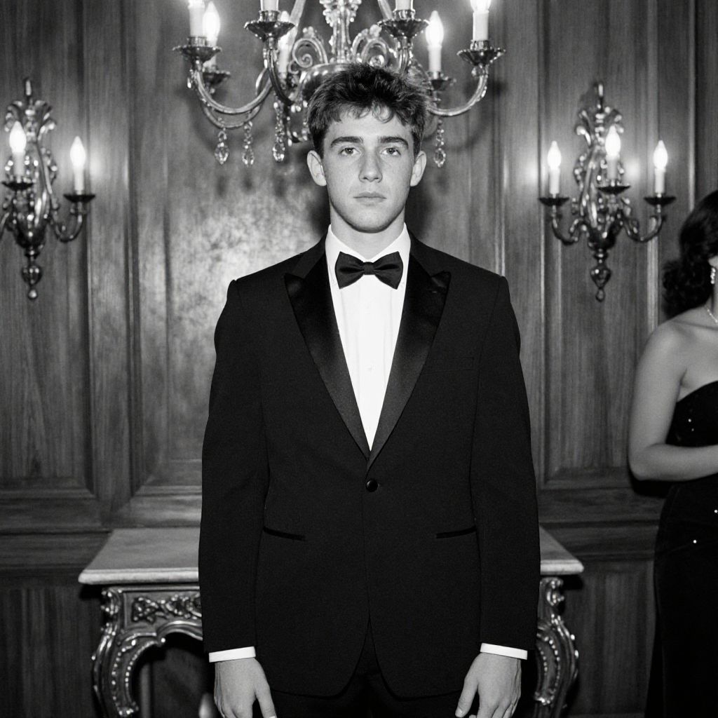 [[man,high school prom photos]]Formal portraiture, candid moment: A young man, dressed impeccably in a tailored black tuxedo, stands proudly against a vintage backdrop, adorned with ornate chandeliers, rich wood paneling, and soft golden lighting, captured on 35mm black and white film, nostalgic charm exudes from every frame. Man has masculine face and piercing eyes