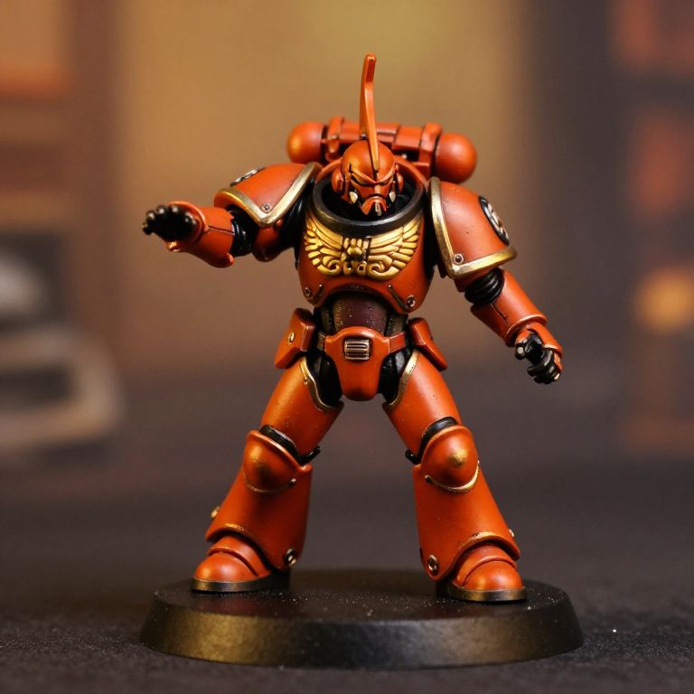 The image showcases a meticulously painted Warhammer 40,000 miniature figure, standing in a dynamic pose on a round base. The figure is adorned in a striking dark orange and gold color scheme, with intricate details highlighting the Terminator armor. The helmet is long and sleek, adding to the imposing presence of the character. The armor is segmented with gold accents, creating a visually striking contrast against the darker hues. The figure is positioned in a dancing stance, with one arm extended forward and the other bent at the elbow, exuding a sense of motion and readiness for battle. The background is softly blurred, drawing focus to the figure, and features warm, incandescent lighting that enhances the metallic sheen of the armor. The overall composition is balanced, with the figure centrally placed, and the depth of field is shallow, emphasizing the figure while softly blurring the surroundings. The lighting and color palette create a dramatic and cinematic atmosphere, capturing the essence of the Space Marine Astartes Primaris.