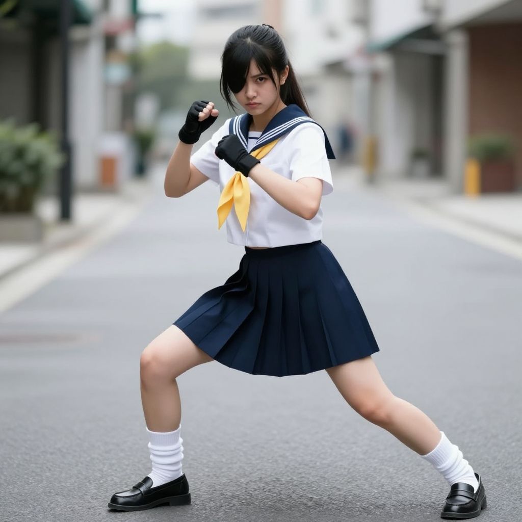((masterpiece, best quality, detailed)), 1girl, solo, outdoors, street, fighting pose, serious, kanu unchou, fingerless gloves, serafuku, midriff, loose socks, pleated skirt, yellow neckerchief, earrings, low-tied long hair, hair over one eye, loafers