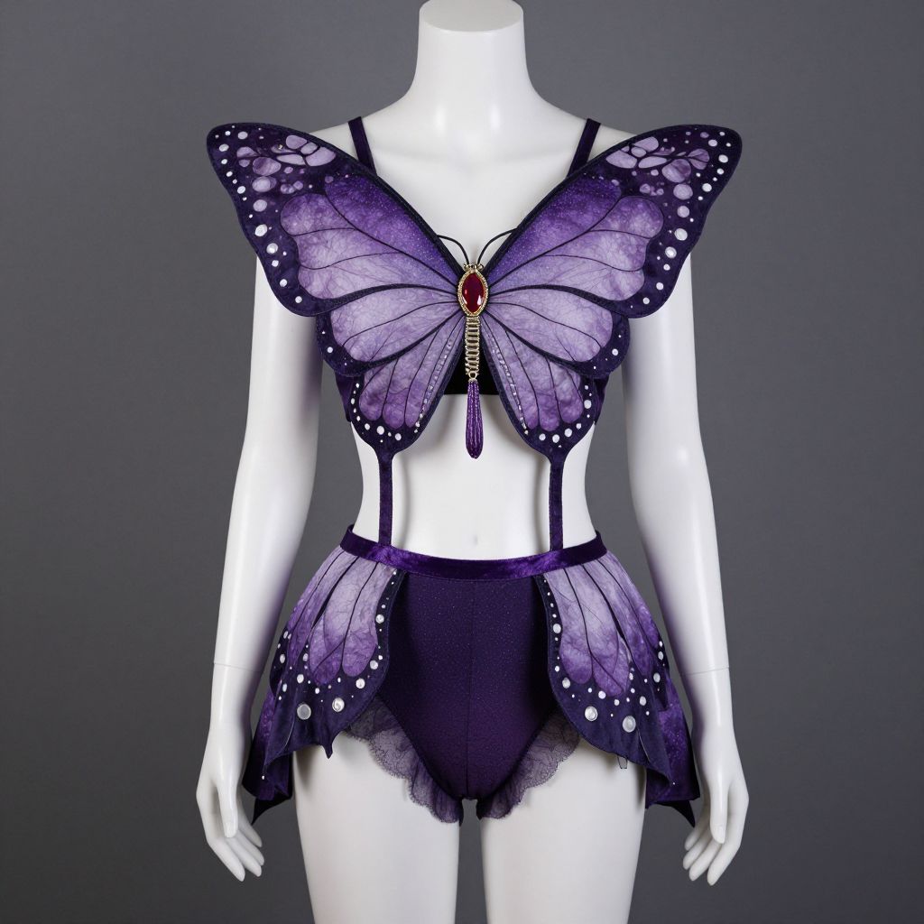 Photorealistic digital rendering of a white mannequin in purple butterfly-themed lingerie with translucent wings, black straps, and a gemmed center.