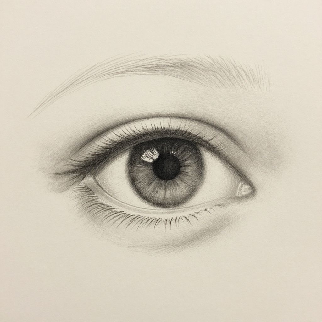 How to draw something realistic: a detailed step-by-step guide showing the process of sketching a lifelike human eye, focusing on shadows, reflections, and textures, in soft pencil strokes against a neutral background, hyper-realistic style.